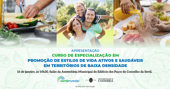 O Salão da Assembleia Municipal do Edifício dos Paços do Concelho da Sertã, acolhe no dia 16 de janeiro às 14h30m, a cerimónia de apresentação pública do Curso de Especialização em Promoção de Estilos de Vida Ativos e Saudáveis em Territórios de Baixa Densidade.