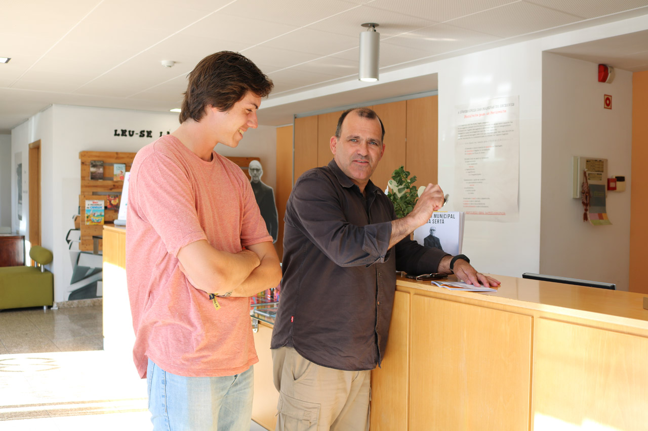 O escritor Afonso Reis Cabral visitou a Biblioteca Municipal Padre Manuel Antunes, na Sertã, na passada sexta-feira (3 de maio). A visita aconteceu no final de mais uma etapa do desafio que o escritor, vencedor do Prémio Leya em 2014, abraçou de percorrer a pé a mítica EN2. Esta jornada pedestre do conhecido escritor, trineto de Eça de Queiroz, vai levá-lo a percorrer os 738 quilómetros da EN2. Durante a visita à Biblioteca Municipal Padre Manuel Antunes, Afonso Reis Cabral foi recebido pelo Adjunto do Presidente da Câmara Municipal da Sertã, António José Simões, com quem trocou algumas impressões sobre o espaço e também sobre a EN2. |