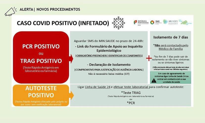 Após testar positivo, o utente deverá contactar a Linha Saúde SNS24 (808 24 24 24) e ter consigo o seu CC e marcar os números pedidos durante a chamada, confirmando com a tecla cardinal (#). |