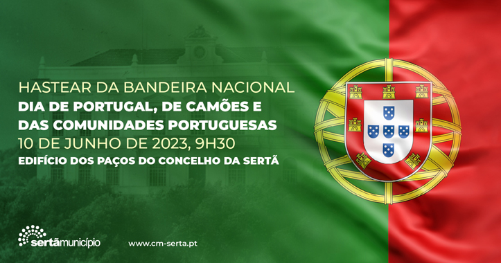 No próximo sábado, dia 10 de junho, às 9h30m decorrerá o Hastear da Bandeira Nacional no Edifício dos Paços do Concelho da Sertã, como forma de assinalar o Dia de Portugal, de Camões e das Comunidades Portuguesas.
