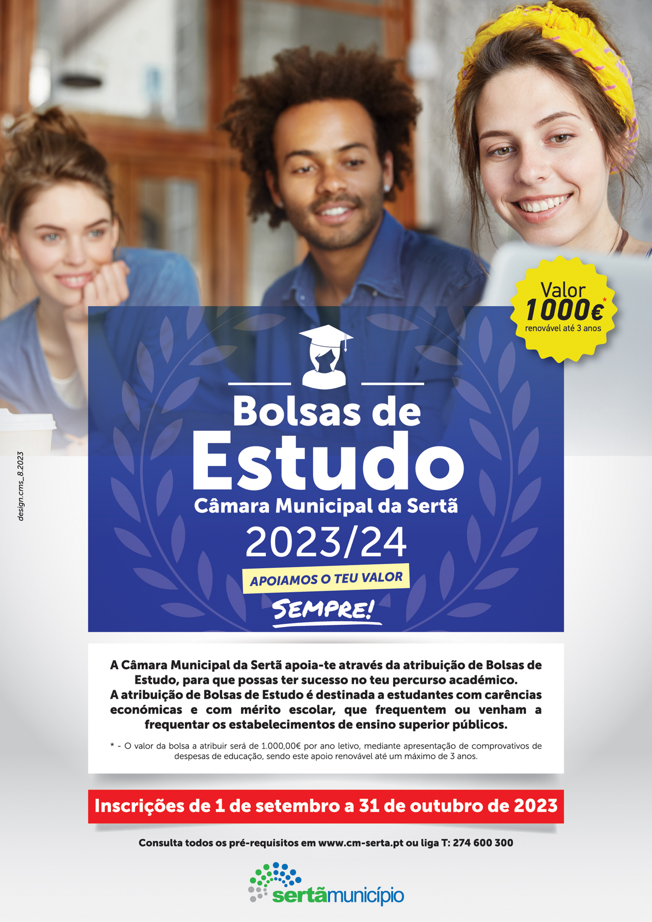 As Bolsas de Estudo destinam-se a estudantes que residam no concelho da Sertã há pelo menos três anos, matriculados no grau académico de licenciatura ou mestrado integrado em estabelecimentos de ensino superior públicos. Para terem direito ao apoio, os alunos deverão ainda ter mérito escolar e ser beneficiários de um dos três primeiros escalões do abono de família, entre outros requisitos de acesso. Cada Bolsa de Estudo tem um valor máximo de 1.000 euros, por ano letivo, mediante apresentação de comprovativos de despesas de educação, sendo este apoio renovável até um máximo de três anos. Refira-se que até 31 de outubro decorre igualmente o prazo para a renovação dos apoios concedidos nos anos anteriores.