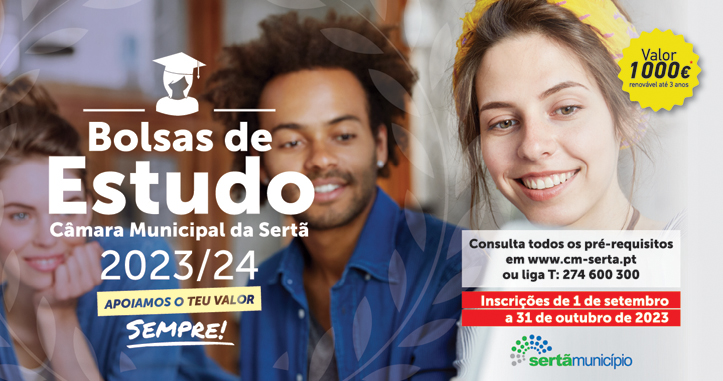 Até 31 de outubro estão a decorrer as candidaturas para a atribuição de Bolsas de Estudo a estudantes do concelho da Sertã que frequentem ou venham a frequentar o ensino superior. Ciente da importância que a educação desempenha no desenvolvimento da comunidade, com esta iniciativa, que segue já na sua décima edição, o Município da Sertã pretende fomentar o sucesso escolar e garantir a continuidade de estudos dos munícipes, através da atribuição de apoios baseados em requisitos de natureza socioeconómica e em critérios de mérito escolar.