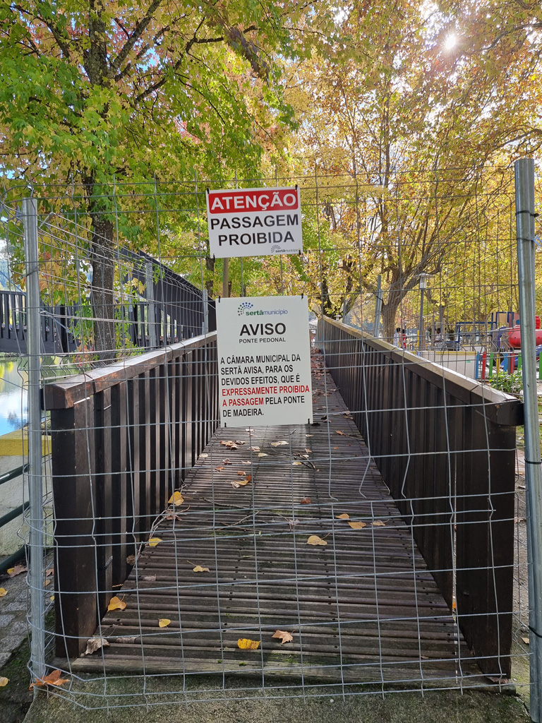 A Câmara Municipal da Sertã informa que a Ponte Pedonal (vulgo ponte de madeira), que faz a ligação da Alameda da Carvalha ao jardim da Serrada, na Sertã, se encontra interdita à passagem de peões.