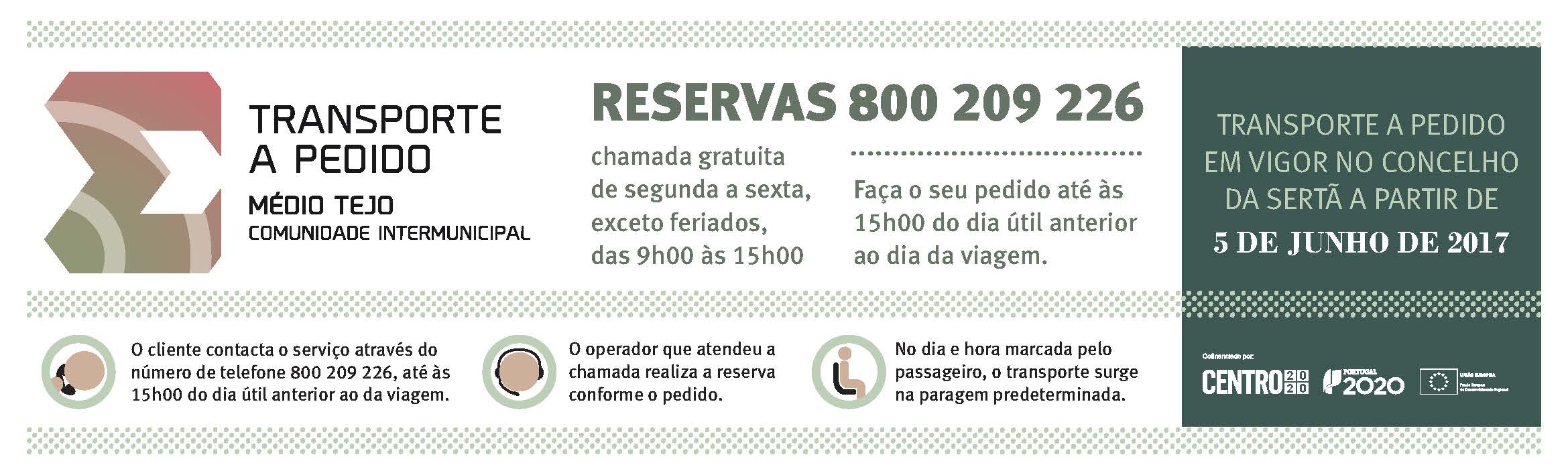 As reservas poderão ser efetuadas até às 15:00h do dia útil anterior ao dia da viagem, através de chamada gratuita para o número de telefone 800 209 226.