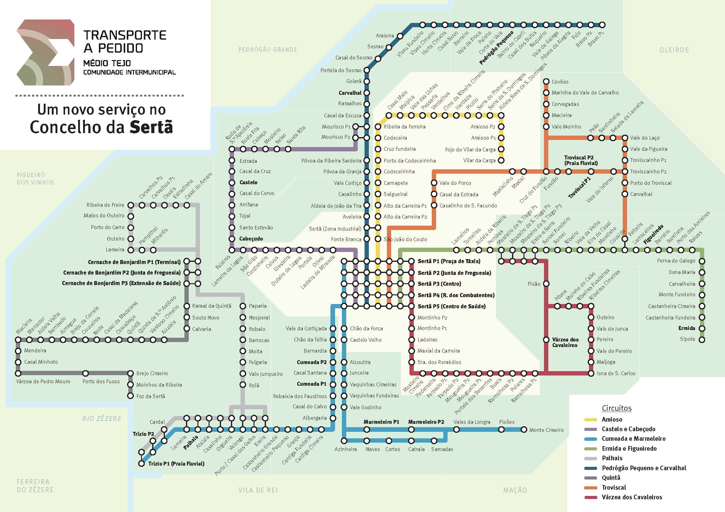 Existem 40 circuitos do serviço de Transporte a Pedido a funcionar nos concelhos de Abrantes, Alcanena, Constância, Mação, Ourém, Sardoal, Tomar e Vila Nova da Barquinha.