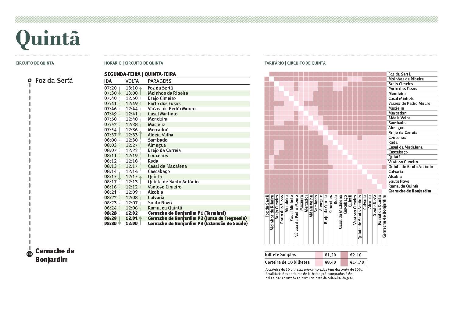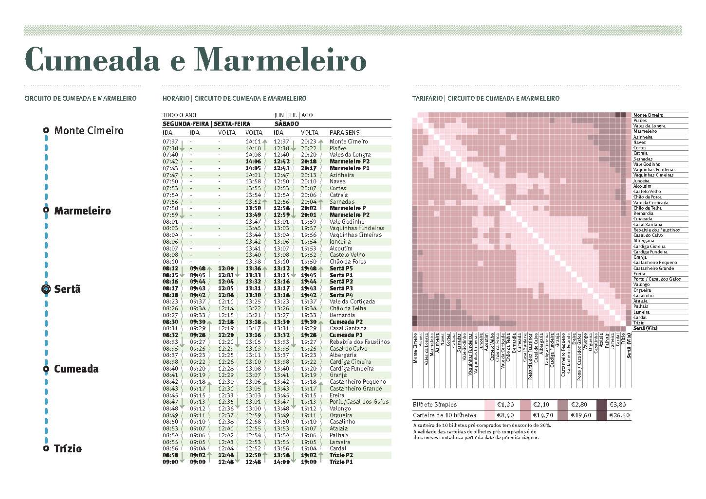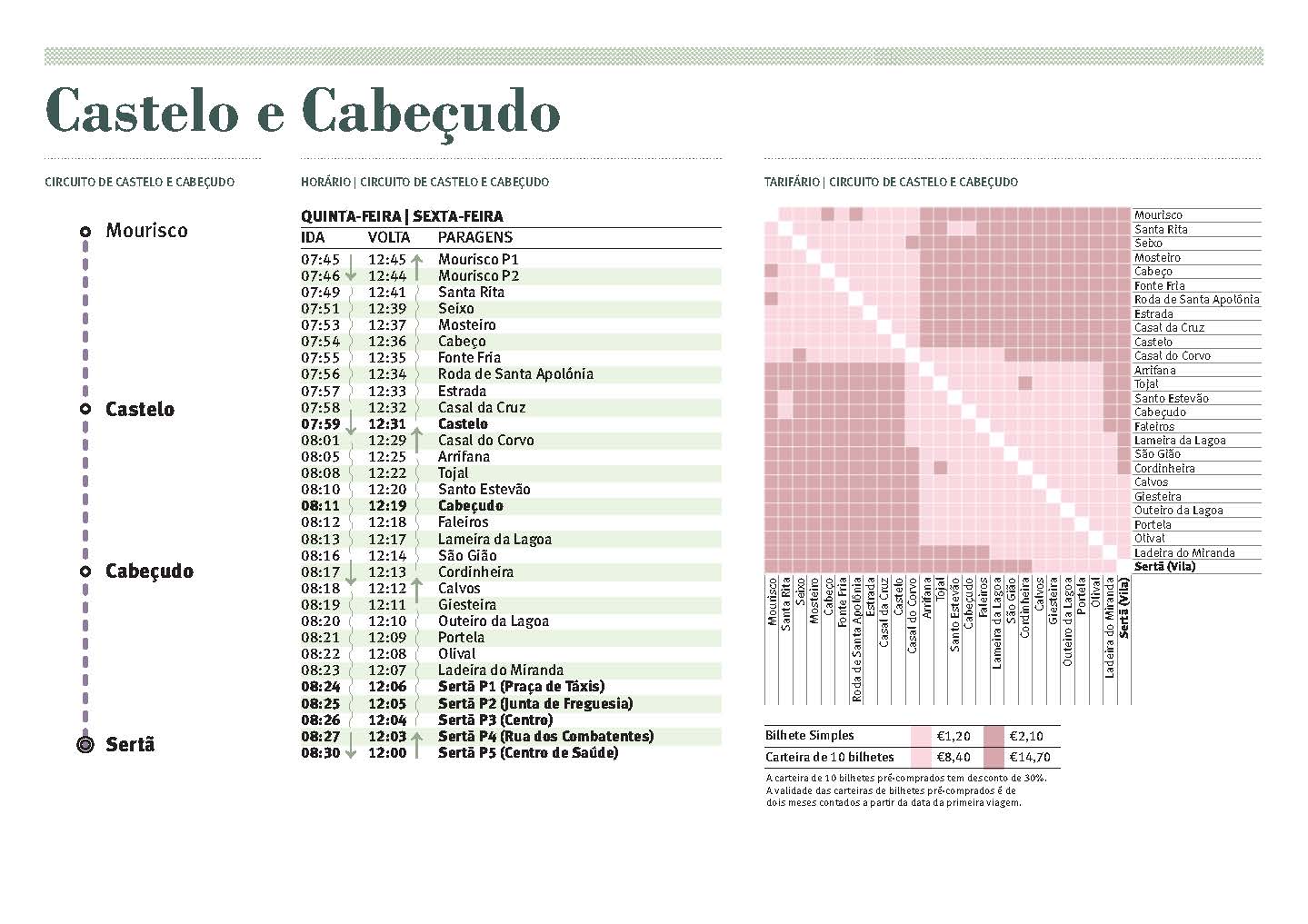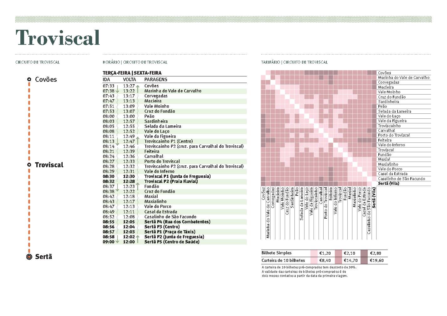 Os circuitos permitem o acesso ao Mercado Semanal da Sertã, realizado às sextas-feiras, e ao Mercado Semanal de Cernache do Bonjardim, realizado às segundas-feiras, e o acesso da população residente na freguesia do Troviscal à Praia Fluvial do Troviscal durante todo o ano, no horário definido.