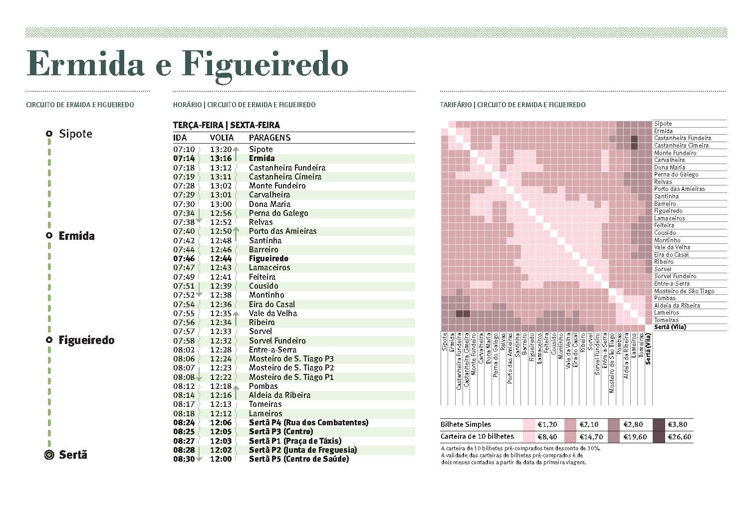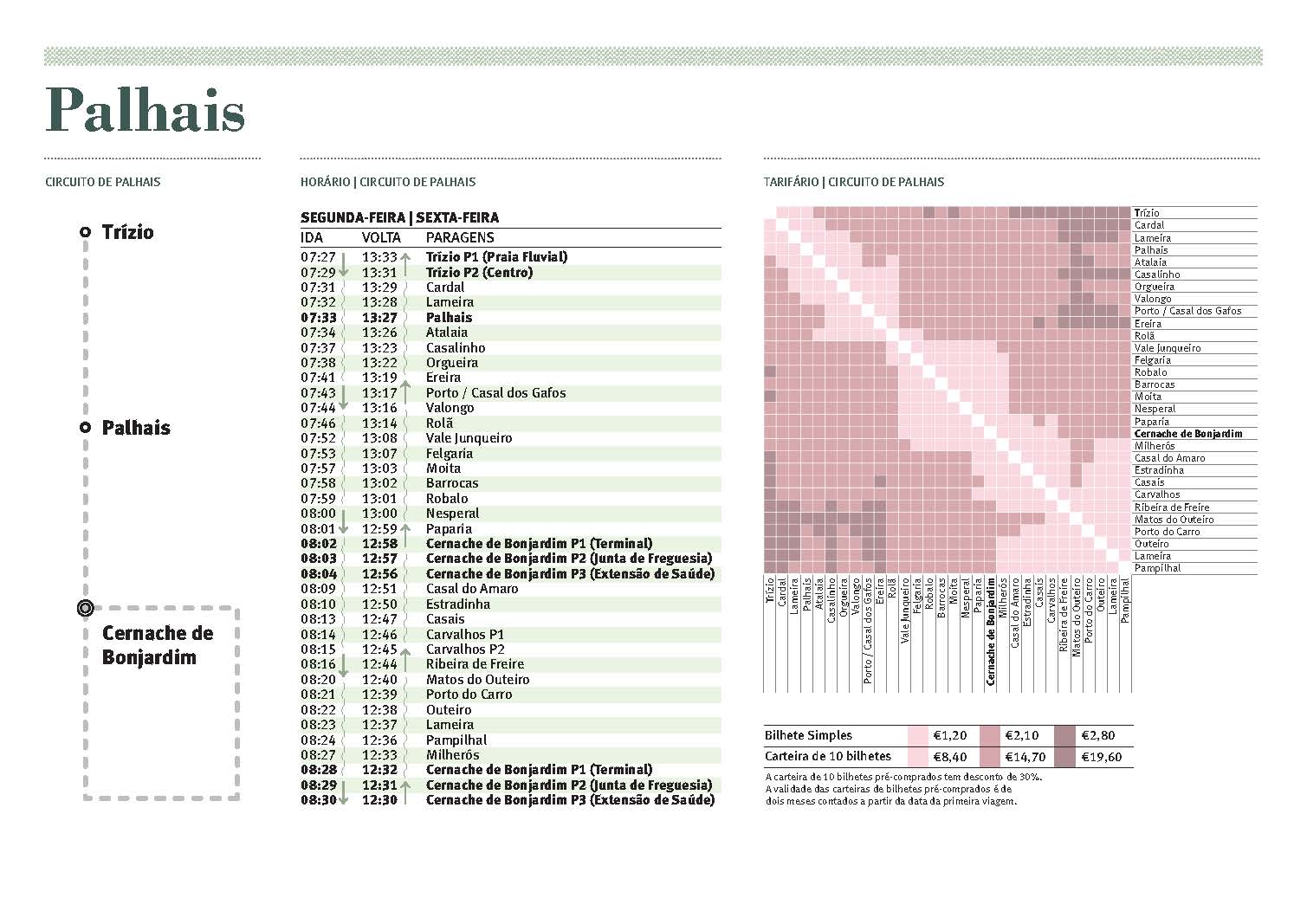 O bilhete é cobrado pelo motorista e por viagem. As tarifas variam entre 1,20€ e 3,80€ de acordo com a distância origem/destino.