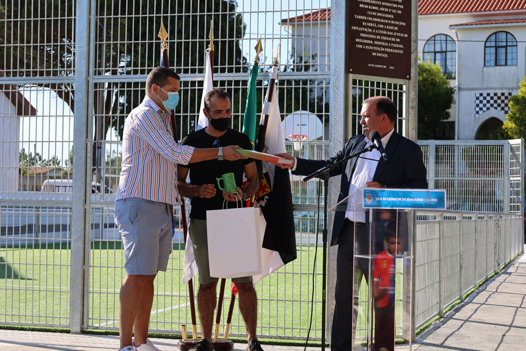 Seguiu-se a apresentação e abertura do Polidesportivo do Clube Bonjardim, frente à antiga Escola Primária. Depois de descerrada a placa, esta foi benzida pelo Padre Paulo Ribeiro. Seguiram-se palavras de agradecimento de António Simões, Presidente da Direção do Clube Bonjardim, ao sócio Décio Ramos pelo contributo que possibilitou disponibilizar o equipamento que irá permitir aos mais novos melhores condições para praticar desporto. Acrescentou que o Polidesportivo chegou no momento certo e agradeceu também a todos quantos permitiram a rápida conclusão da obra. A direcção do Clube do Bonjardim ofereceu lembranças evocativas do momento a Décio Ramos, ao Presidente da Câmara Municipal da Sertã e a Filomena Bernardo, Presidente da União de Freguesias de Cernache do Bonjardim, Nesperal e Palhais. Como lembrança foi entregue a Biografia de Abílio Marçal (uma obra da autoria de Pedro Marçal Vaz Pereira ainda não lançada) e a caneca do Bar do Clube, símbolo de um dos festivais mais concorridos da região.