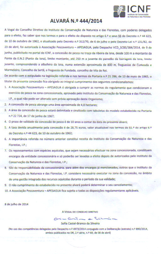 Concessão de Pesca da Ribeira da Isna – Alvará n.º444/2014